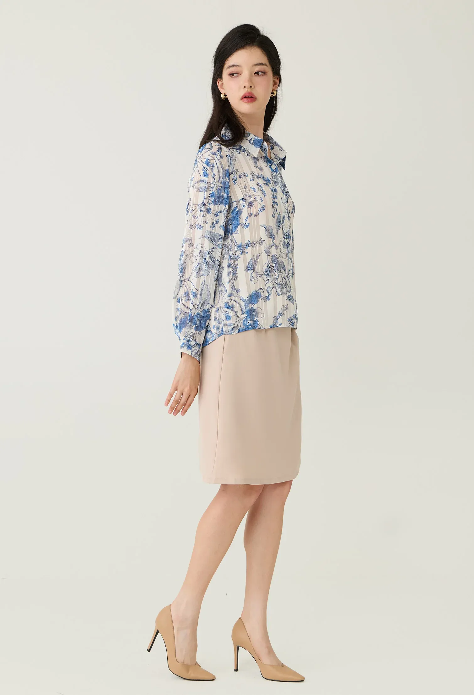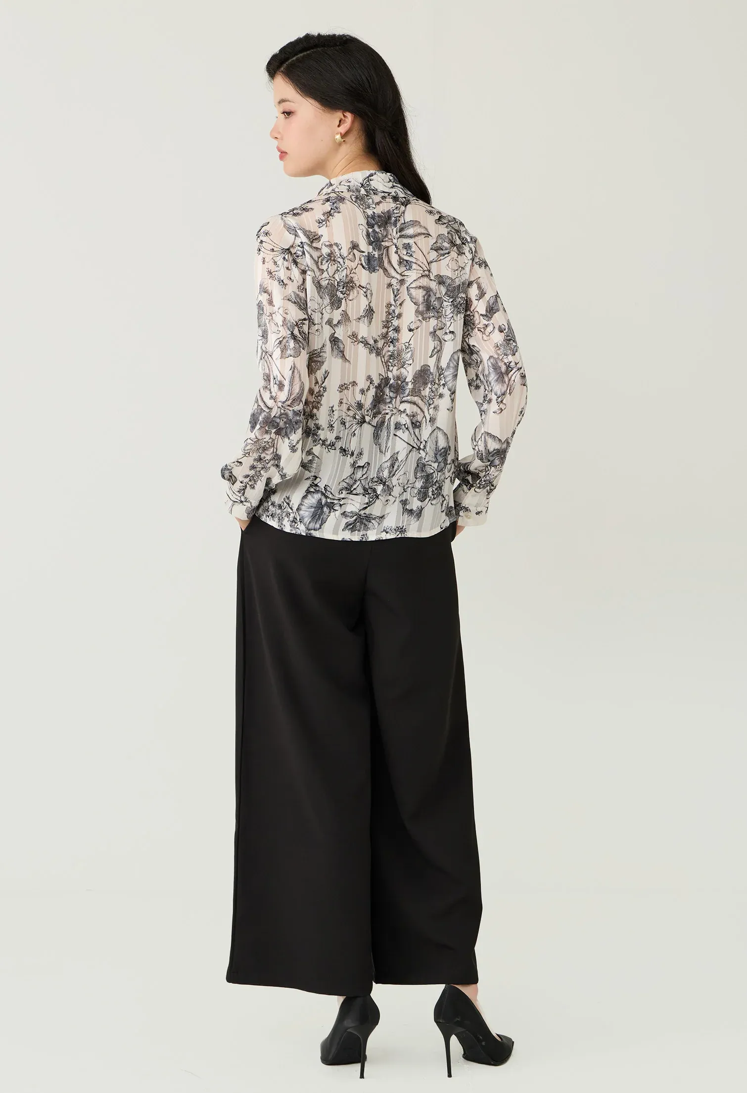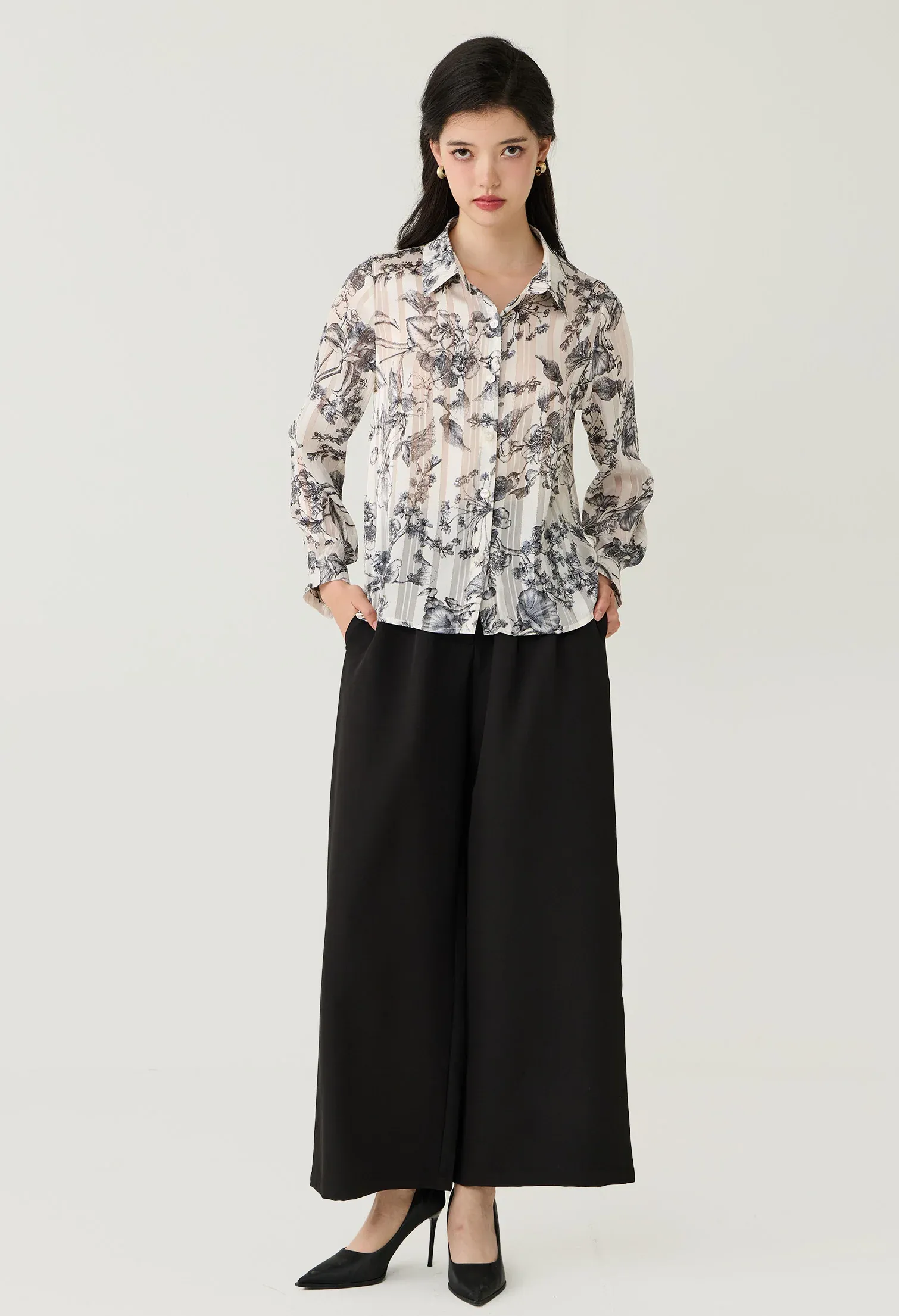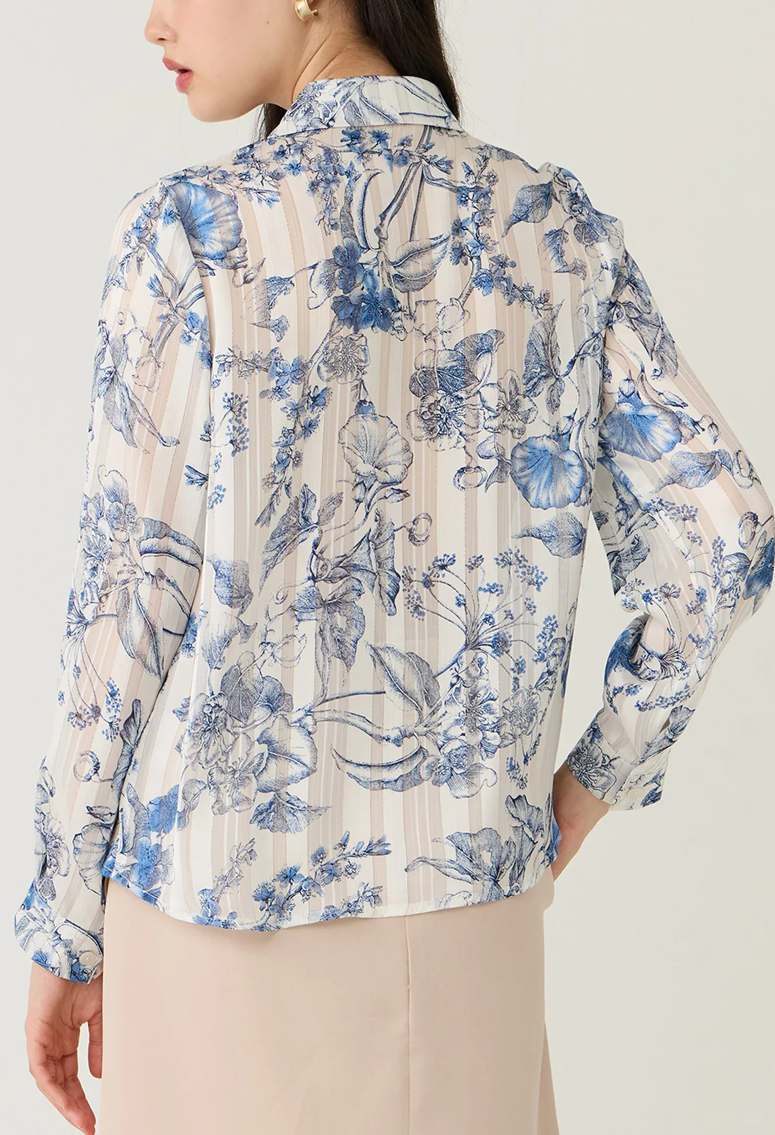 Floral Toile Sheer Button-Down Blouse