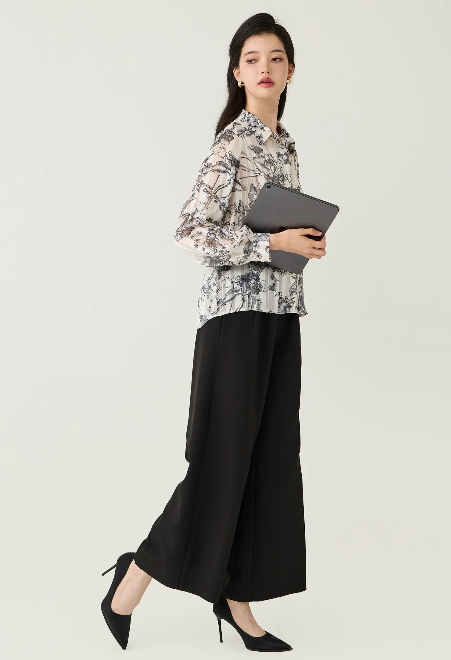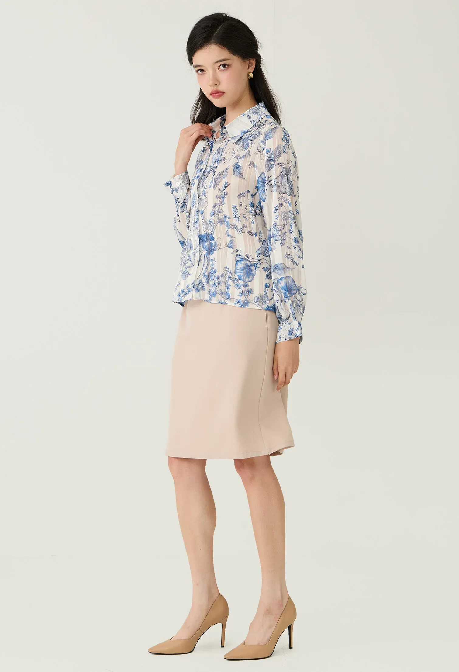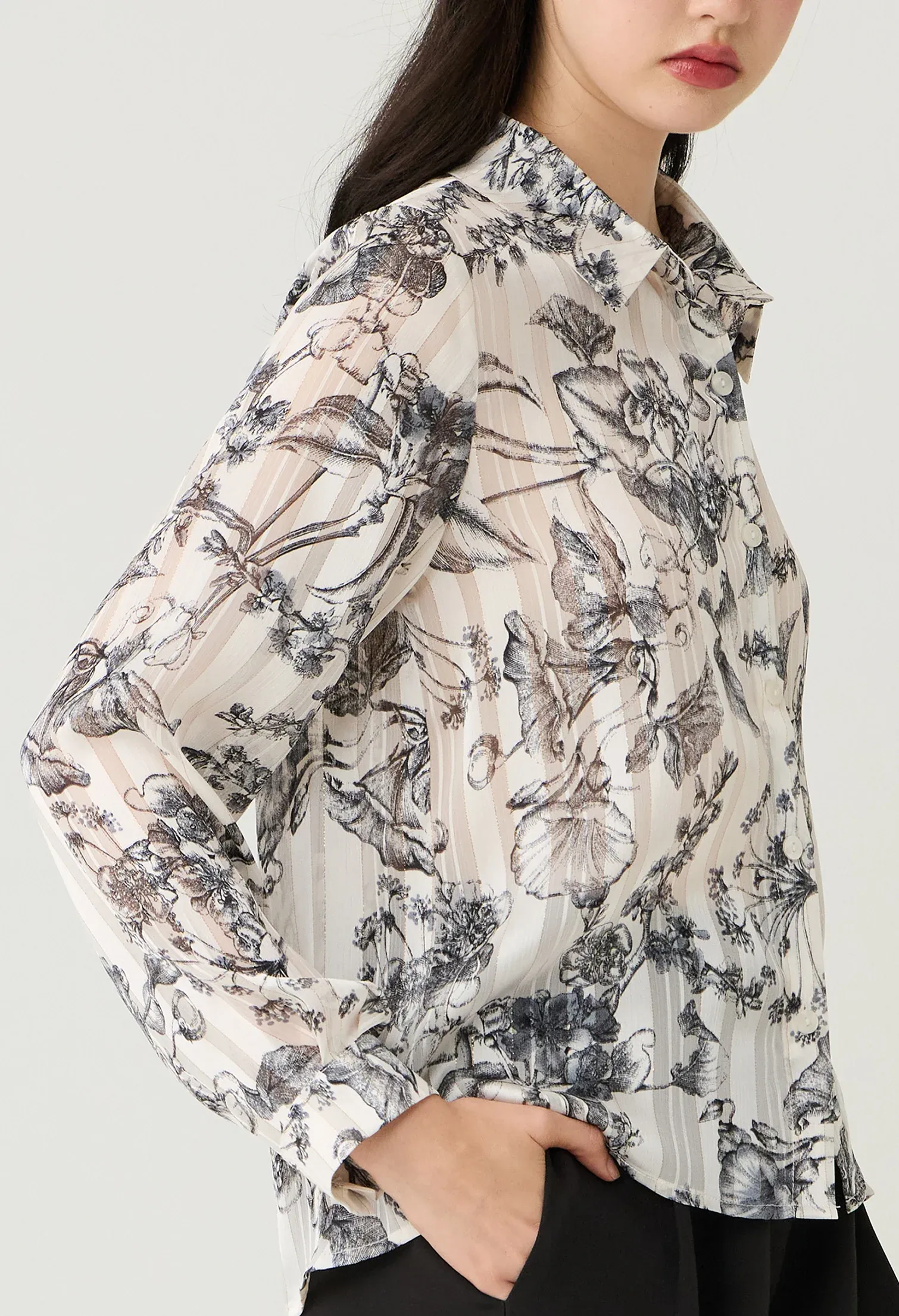 Floral Toile Sheer Button-Down Blouse